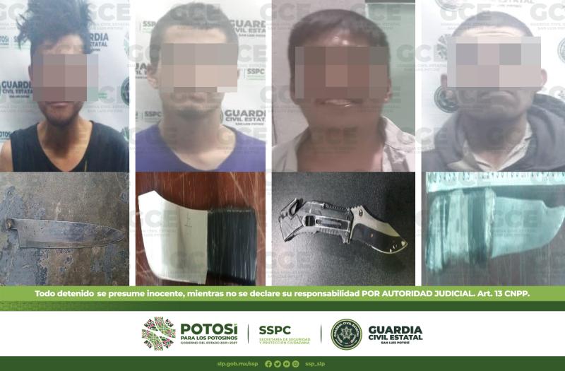Gracias a las constantes acciones de vigilancia realizadas por agentes de la Guardia Civil Estatal (GCE) en la capital potosina y su zona conurbada, cuatro hombres resultaron detenidos por el probable delito de portación de armas prohibidas.