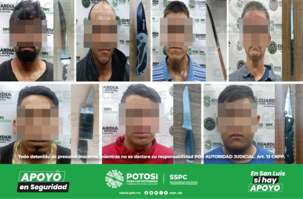 Elementos de la Guardia Civil Estatal (GCE) detuvieron a siete personas en diferentes acciones operativas, luego de que se les sorprendiera en probable posesión de armas punzocortantes, con ello se inhibió la posible comisión de algún hecho que pudiera vulnerar la paz pública.