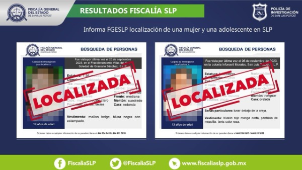 Dos jóvenes que habían sido reportadas como no localizadas en la demarcación potosina, fueron ubicadas mediante las labores implementadas por la Dirección General de Métodos de Investigación (DGMI), informó la Fiscalía General del Estado de San Luis Potosí (FGESLP).