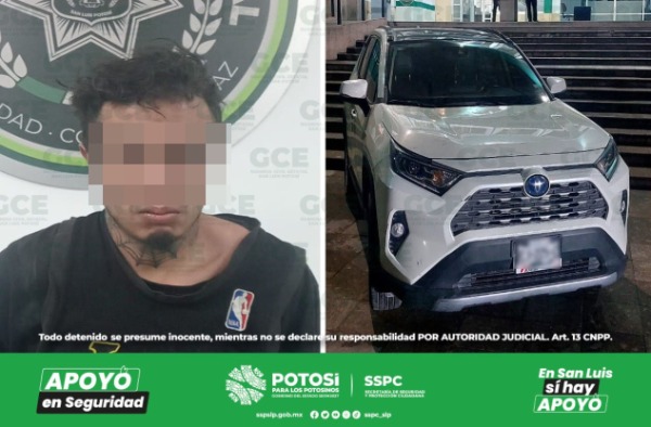 Los hechos se suscitaron en la colonia Simón Díaz, lugar en donde agentes de la GCE evitaron que el conductor de una camioneta marca Toyota, tipo Rav-4, modelo 2021, huyera de la zona; la unidad antes descrita fue reportada como robada minutos antes, en la colonia Tepeyac de la capital potosina.