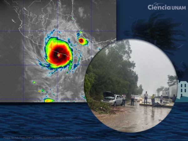 Imagen compuesta que muestra la destrucción en Acapulco post-huracán Otis con un mapa satelital del huracán en su máxima intensidad a la izquierda y una fotografía de personas evaluando los daños en una carretera inundada con árboles arrancados y vehículos varados, a la derecha. Incluye el logo de ´Ciencia UNAM´, indicando el análisis científico de la Universidad Nacional Autónoma de México.