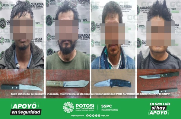 Acciones preventivas, desplegadas por los agentes de la Guardia Civil Estatal (GCE), dieron como resultado la detención de ocho individuos, en diferentes puntos de la capital potosina, quienes fueron sorprendidos en presunta portación de cuchillos y machetes.