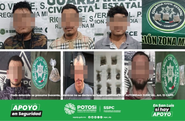 En la colonia Mirasol, en el municipio de Tamuín, Adrián "N" de 27 años de edad, fue detenido con tres dosis de "cristal"; Osmar "N" de 18 años, fue asegurado con cuatro bolsas con marihuana, en la zona centro de El Naranjo; Mario "N" de 20 años, fue ubicado en el municipio de Axtla de Terrazas, con una dosis de marihuana; otro de los sucesos ocurrió en el municipio de Tanquián de Escobedo, José "N" de 24 años fue detenido con dos dosis de marihuana; en el municipio de Ciudad Valles, Francisco "N" de 23 años, fue capturado con dos dosis de "cristal"; en el municipio de Tamazunchale, elementos de la GCE aseguraron en la colonia Los Naranjos, una motocicleta con una mochila, dentro de la cual había nueve dosis de "cristal".