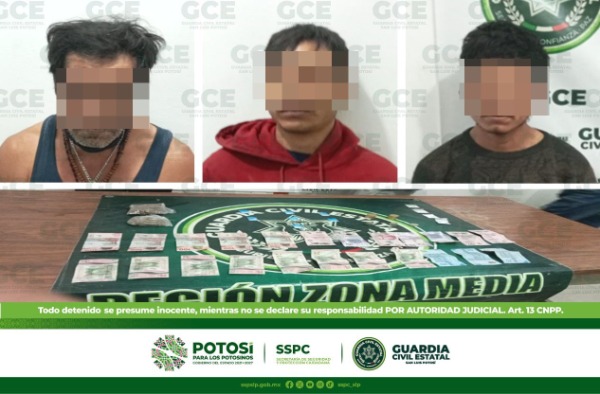 Dentro de la estrategia implementada en el combate a grupos de la delincuencia organizada que son generadores de violencia, elementos de la Guardia Civil Estatal, aseguraron a tres personas vinculadas a un grupo delincuencial, quienes se encontraban presuntamente en un "punto" de venta de droga en la avenida Universidad del ejido Puente del Carmen, en el municipio de Rioverde.
