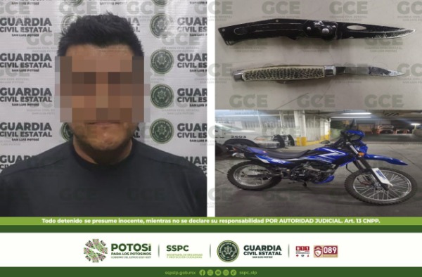 Mediante los dispositivos de seguridad que son instalados en zonas estratégicas del territorio potosino, elementos de la Guardia Civil Estatal (GCE) detuvieron al conductor de una motocicleta, después de que presumiblemente manejaba de manera temeraria, además se le aseguraron dos armas blancas.