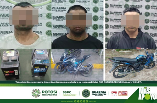 Uno de los sucesos tuvo lugar en la colonia Rural Atlas, ahí fue detenido Isaac "N" de 24 años de edad, luego de asegurarle una motocicleta sin placa, la cual tenía reporte de robo del año 2023, en el fraccionamiento Estrellas de Oriente; mientras que en el municipio de Soledad de Graciano Sánchez, agentes de la GCE detuvieron a Erik "N" de 39 años y a Carlos "N" de 31 años, vinculado al robo de vehículos, además de haber cumplimentado un mandamiento judicial en el 2014, por probables delitos contra el patrimonio.