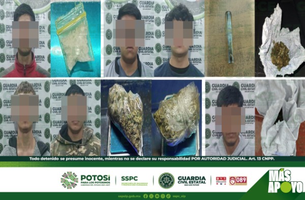 Mediante los dispositivos de seguridad, efectuados en la capital potosina, se detuvo a Wilfredo "N" de 37 años de edad, con una dosis de "cristal", en la colonia División del Norte; en la colonia Satélite, José "N" de 24 años, fue asegurado con una dosis de "cristal"; José "N" de 38 años, quedó detenido en la colonia Las Julias, con una dosis de marihuana; sobre la colonia Las Mercedes, Josué "N" de 30 años, fue asegurado con un envoltorio que tenía marihuana; en la Unidad Ponciano Arriaga, Luis "N" de 19 años y Hevilat "N" de 18 años, fueron asegurados con una lata y un envoltorio que tenían marihuana; mientras que en la colonia Arboledas del Real, Francisco "N" de 24 años y Genaro "N" de 26 años, quedaron detenidos con dos dosis de marihuana.