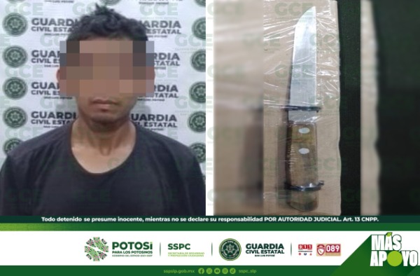 Patrullajes preventivos, efectuados por policías de la Guardia Civil Estatal (GCE), derivaron en la detención de un hombre, en la zona centro de la capital potosina, por el probable delito de portación de un arma blanca.