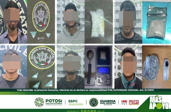 Mientras que en la colonia Simón Díaz, Jesús "N" de 18 años de edad, fue asegurado con tres bolsas con marihuana; a su vez, en la colonia El Saucito, Jesús "N" de 26 años, resultó detenido con una dosis de marihuana; en el Barrio San Juan de Guadalupe, Agustín "N" de 56 años, fue asegurado con una dosis de "cristal"; en el sector oriente, efectivos de la GCE detuvieron en Soledad de Graciano Sánchez, fue detenido Harold "N" de 19 años de edad, tras ser descubierto con una dosis de marihuana, en la colonia Praderas del Maurel.
