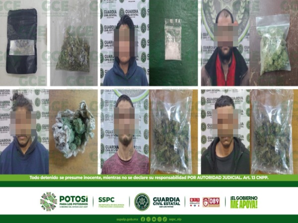 A su vez, en el municipio de Soledad de Graciano Sánchez, en la colonia San José del Barro, Yahir "N" de 29 años de edad, resultó detenido con una dosis de "cristal"; Miguel "N" de 24 años, quedó detenido en la colonia 21 de Marzo, con una dosis de marihuana; por su parte, en el municipio de Mexquitic de Carmona, Juan "N" de 21 años, fue asegurado con una dosis de marihuana; al interior del Estado, en Ciudad del Maíz, Yohaja "N" de 18 años, fue detenido con dos dosis de marihuana; en el municipio de Matehuala, Iván "N" de 36 años, fue detenido con dos dosis de "cristal".