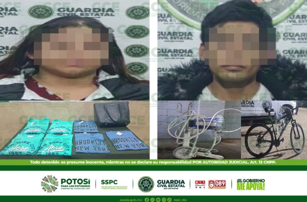 Agentes de la Guardia Civil Estatal detuvieron a dos personas señaladas del delito de robo, una de las detenidas es acusada de robar prendas de vestir de una plaza comercial y otro de apoderarse de una bicicleta y una máquina de pintura.