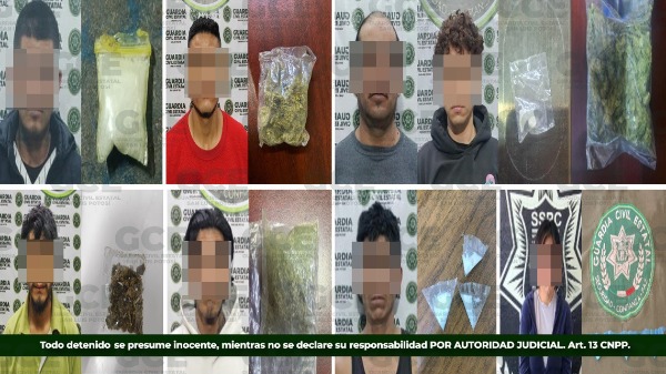 Dispositivos de seguridad, efectuados en el municipio de Rioverde, permitieron la detención de Juan "N" de 46 años de edad, luego de asegurarle dos bolsas con marihuana; en la colonia San Isidro, José "N" de 26 años, fue detenido con una dosis de marihuana; Cristian "N" de 31 años, fue detenido con dos bolsas con marihuana, en el municipio de Matehuala; Catalina "N" de 34 años, quedó detenida con tres dosis de "cristal", en el ejido Rancho Nuevo; Erik "N" de 35 años, quedó detenido con una bolsa con marihuana; durante los recorridos en la colonia Olivar de las Ánimas, en Matehuala, se detuvo a Francisco "N" de 27 años, con dos dosis de "cristal"; por último, Eduardo "N" de 33 años y Edwin "N" de 20 años, quedaron detenidos en la calle Héroes de Nacozari, tras asegurarles dos dosis de "cristal" y una de marihuana.