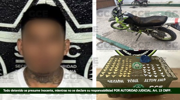Al presunto, se le aseguraron 15 bolsas de marihuana, 55 dosis de "cristal", 21 dosis de cocaína, 19 dosis de "crack" y una motocicleta Italika color verde con blanco, sin placas, sin reporte negativo.