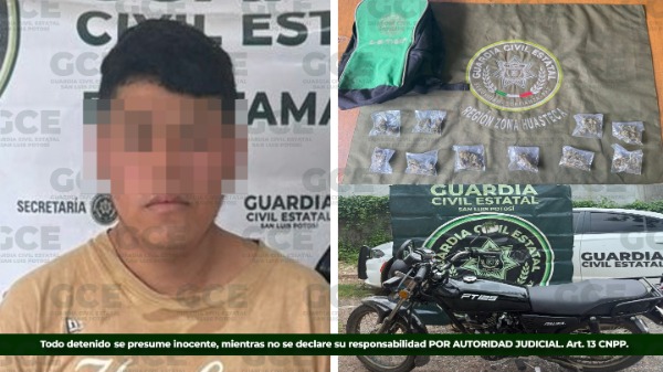 Al presunto, se le aseguraron 10 bolsas con marihuana y una motocicleta en la cual se desplazaba, como parte de las acciones constantes para que las y los potosinos, puedan seguir dsifrutando un Potosí sin límites.