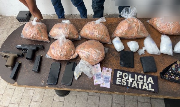 En Hermosillo, se detuvo a cuatro personas, se aseguraron dos armas cortas, dos cargadores, 32 cartuchos útiles, 700 dosis de metanfetamina, 700 dosis de marihuana, un vehículo, dos celulares y dos carteras.