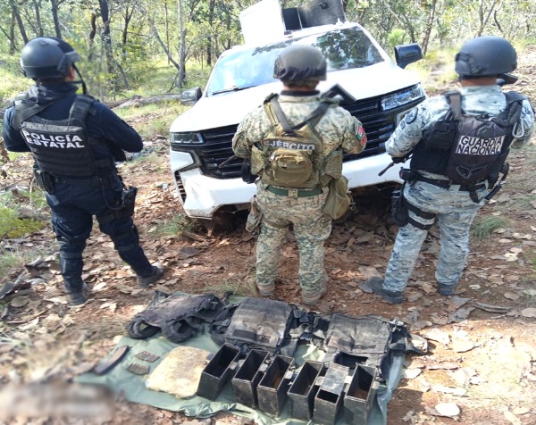 -En Acaponeta, en el poblado Cañones, elementos de GN, Ejercito Mexicano y Policía Estatal localizaron un vehículo con blindaje de fábrica, aseguraron una placa balística, un cargador, seis cofres metálicos para cartuchos, 20 cartuchos y tres chalecos tácticos.