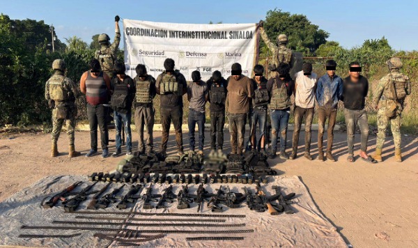 -En Navolato, en el poblado La Vuelta, elementos de Semar detuvieron a 13 personas, aseguraron 14 armas largas, cartuchos útiles, 60 cargadores, siete cintas eslabonadas, nueve chalecos tácticos, ocho motocicletas y tres vehículos.