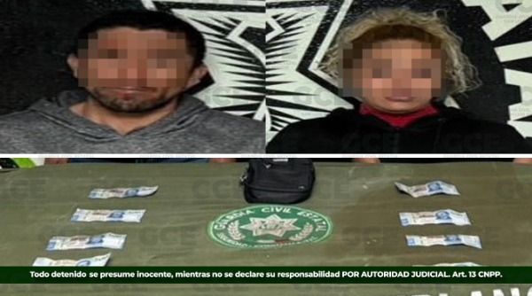 Mediante un dispositivo de seguridad, efectuados en la zona centro del municipio de Matehuala, efectivos de la Guardia Civil Estatal detuvieron a una pareja, originaria del Estado de México, identificados como Izeth "N" de 34 años y de Enrique "N" de 36 años, tras ser denunciados por el responsable de una tienda, luego de que trataran de pagar con billetes apócrifos. A los presuntos se les aseguraron ocho billetes con denominación de 500 pesos.