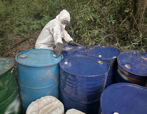 En Tamazula, Durango, en el poblado El Aguaje, elementos del Ejército Mexicano localizaron e inhabilitaron un área de concentración de material diverso para la elaboración de metanfetamina, asegurando 2,250 litros de sustancias químicas, un reactor de síntesis orgánica, un destilador y dos quemadores.