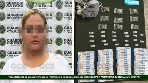A la presunta, quien cuenta con antecedentes por el delito de fraude, se le aseguraron nueve dosis de marihuana, 22 dosis de "cristal" y 29 mil 500 pesos.