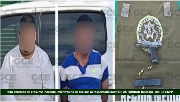A través del dispositivo "Zona Media Segura", agentes de la GCE detuvieron a dos presuntos, en el municipio de Rioverde, luego de asegurarles un arma de fuego, abastecida con un cargador y cinco cartuchos útiles, además de dos bolsas con marihuana y una camioneta marca Toyota, donde se encontraban.