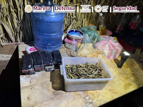 Durante la intervención se aseguraron seis armas largas, 27 cargadores, 760 cartuchos útiles, 13 chalecos balísticos, 19 cascos balísticos, 14 pares de botas, diverso equipo táctico y 54 dosis de metanfetamina.