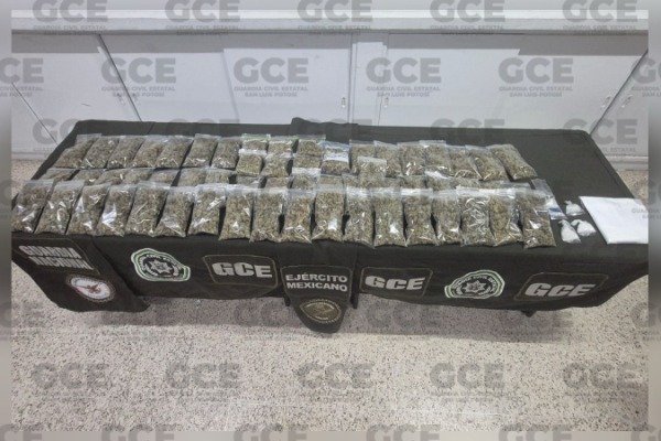 Durante el despliegue de la Base de Operaciones Mixta Interinstitucional (BOMI), las autoridades estatales y federales, desplegaron un recorrido sobre el municipio de Villa de Pozos, en donde un reporte ciudadano los movilizó hacia la localidad de La Morena en San Nicolás de los Jassos, donde realizaron el hallazgo de cinco kilos de marihuana, distribuidos en 58 bolsas, cuatro dosis de "cristal" y una de cocaína.