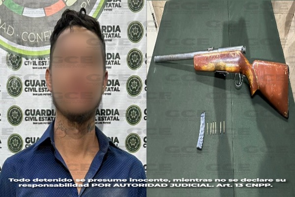 Derivado de los trabajos preventivos, desarrollados en el municipio de Villa de Arriaga, efectivos de la Guardia Civil Estatal atendieron un reporte del C5i2, donde indicaban que un sujeto había sido visto en la localidad El Mezquital con un arma de fuego. De inmediato arribaron al lugar y visualizaron al presunto, quien, al notar la presencia de los uniformados, pretendió agredir a los elementos, tras detonar un arma de fuego larga.