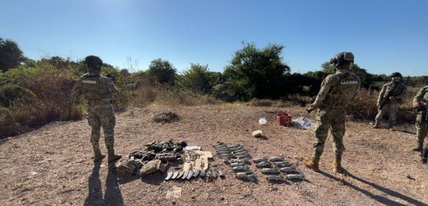 En Escuinapa, se aseguraron 10 cargadores, 430 cartuchos útiles, 25 artefactos explosivos improvisados, cinco chalecos tácticos y un vehículo.