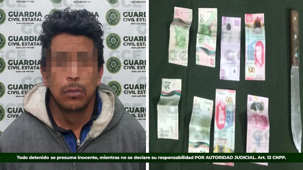Agentes de la Guardia Civil Estatal detuvieron a Raúl "N" de 36 años, alias "Chano", quien es señalado como posible perpretador de múltiples robos a comercio en la capital potosina, al cual se le aseguró un cuchillo y 380 pesos en efectivo.