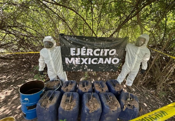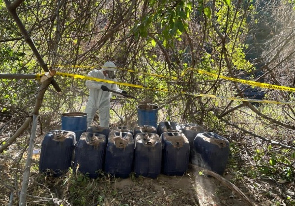 En Culiacán se localizaron e inhabilitaron tres áreas de concentración de material diverso para la fabricación de drogas sintéticas, se aseguraron 1,760 litros de sustancias para la elaboración de metanfetamina. La afectación económica a la delincuencia organizada es de 34 millones de pesos.