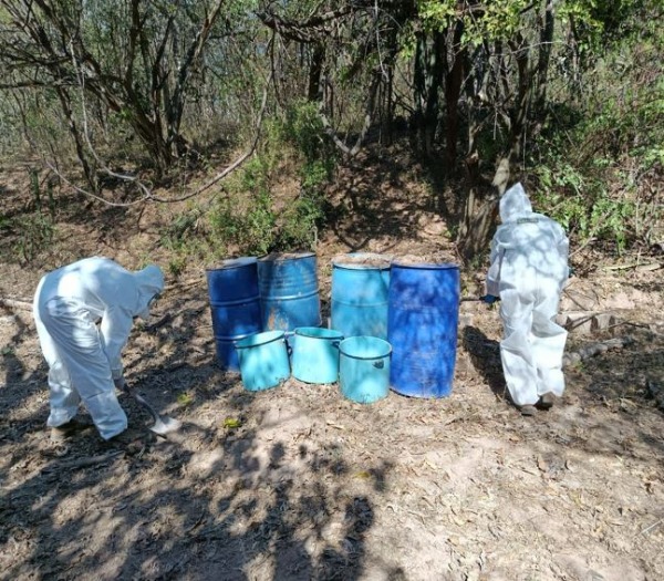 En Culiacán, Sinaloa, en el poblado Corral Viejo, elementos del Ejército Mexicano localizaron e inhabilitaron un área de concentración de material diverso para la elaboración de metanfetamina, asegurando 2,220 litros de sustancias químicas.