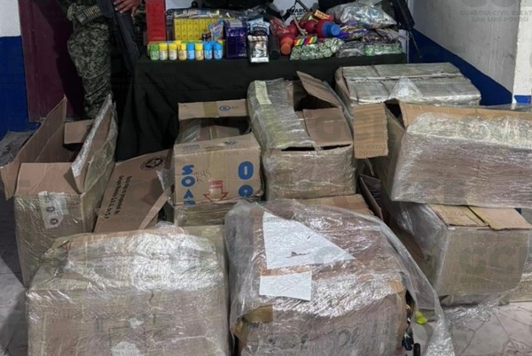 Ante esta situación, los elementos procedieron a inspeccionar las cajas que el sujeto dejó abandonadas en el lugar, localizando en su interior material ilícito y de alto riesgo, consistente en pirotecnia, droga y dispositivos electrónicos. Como resultado de esta acción, se logró el aseguramiento de 13 cajas de pirotecnia variada, así como 12 kilogramos de marihuana y 148 dispositivos electrónicos mejor conocidos como "vapeadores".