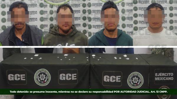 Los detenidos fueron identificados como: Héctor "N", de 41 años, Sergio "N", de 33 años, Antelmo"N", de 28 años y Humberto "N" de 54 años. Durante la intervención, los agentes estatales aseguraron 20 bolsas con sustancia conocida como "cristal", asimismo, 40 bolsas de plástico vacías, las cuales presuntamente estaban destinadas a la dosificación de diversos estupefacientes.
