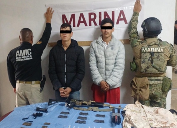 En otra acción en el mismo municipio, se detuvo a dos personas, se aseguró un arma de fuego larga, tres cargadores, 129 cartuchos, dosis de cristal y un vehículo.