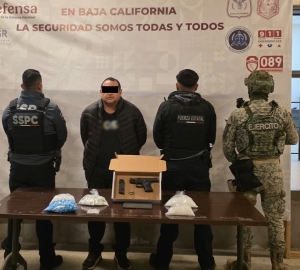-En Tijuana, elementos del Ejército Mexicano, Secretaría de Seguridad y Protección Ciudadana (SSPC) y Policía Estatal detuvieron a una persona, le aseguraron un arma corta, un cargador, tres cartuchos, 2.1 kilos de metanfetamina, dosis de fentanilo y un vehículo.