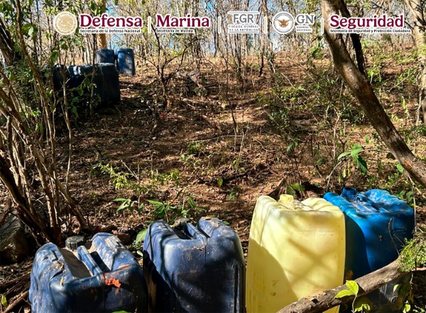 En otra acción, en Cosalá, Sinaloa, al realizar funciones de reconocimiento, se localizaron e inhabilitaron 11 áreas de concentración de material diverso para la elaboración de drogas sintéticas, se aseguraron 16,486 litros y 75 kilos de sustancias químicas.