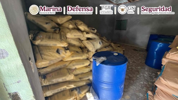 En el marco de las acciones permanentes para el mantenimiento del Estado de derecho, elementos de la Secretaría de Marina (Semar), a través de la Armada de México, en coordinación con la Secretaría de Seguridad y Protección Ciudadana (SSPC), Fiscalía General de la República (FGR), Secretaría de la Defensa Nacional (Defensa) y Guardia Nacional (GN), en dos acciones diferentes, localizaron e inhabilitaron una bodega con precursores químicos y un campamento empleados para la producción de drogas sintéticas, en un poblado del municipio de Petatlán, en el estado de Guerrero.