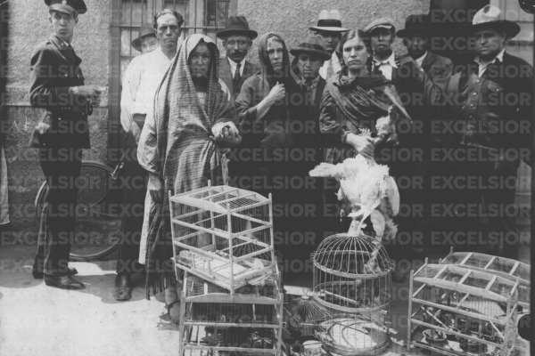 Personas vinculadas a la investigación del multihomicidio de Peralvillo posan junto a jaulas y aves aseguradas como evidencias durante las diligencias del caso que conmocionó a la Ciudad de México en 1929.