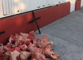 A través de redes sociales, un usuario publicó una imagen donde se ven varias cabezas de cerdo regadas en la entrada de la sede de Morena en Tlalnepantla Estado de México.