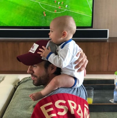 Tras convertirse en padre de mellizos en diciembre pasado, Enrique Iglesias disfruta por primera vez un Mundial en compañía de sus hijos.