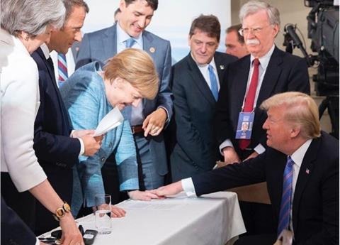 Tras realizarse la cumbre, la canciller de Alemania, Angela Merkel, publicó una foto dónde estaban los miembros del G7 con caras largas alrededor de Trump, quien se mostraba relajado y con una marcada sonrisa.