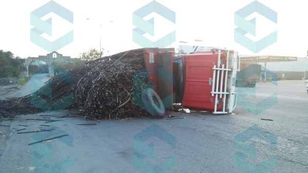 Sobre el bulevar Lázaro Cárdenas frente a la gasolinera de los Arcos de las Tres Culturas se volcó un camión cargado de caña.