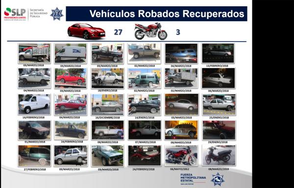 Resultado de las acciones que realiza la Secretaría de Seguridad Pública del Estado para proteger el patrimonio de las familias potosinas, en el periodo correspondiente de 3 al 9 de marzo se logró recuperar 30 unidades con reporte de robo, con ello se refrenda el compromiso de la esta institución con la sociedad.
