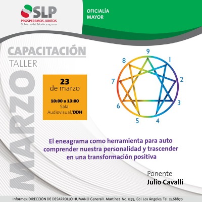El taller se realizará el día viernes 23 de marzo de 10:00 a 13:00 hrs en la sala Audiovisual de la Dirección de Desarrollo Humano de la Oficialía Mayor ubicada en General I. Martínez 1275 Col. Los Ángeles. Este taller se enfocará a través de las herramientas del eneagrama lograr una transformación positiva en las y los participantes que conlleve un cambio en las estructuras laborales.