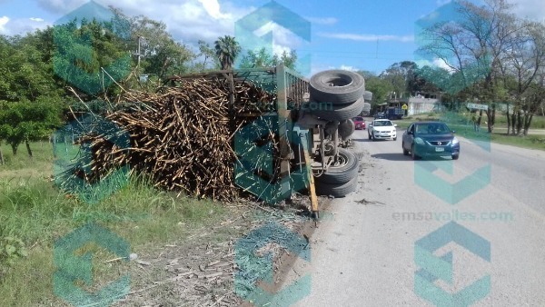 Un remolque tipo jaula cargado de caña se encuentra volcado en el kilómetro 363 de la carretera Valles-Tamazunchale.