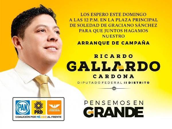 -Ricardo "Pollo" Gallardo Cardona inicia su campaña por la diputación federal este domingo 1 de abril a las 12 del día en la plaza principal de Soledad de Graciano Sánchez.