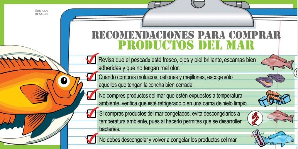 • Que estén frescos para evitar alguna enfermedad gastrointestinal por lo que solo se debe adquirir aquel pescado que presenta los ojos húmedos, brillantes y cristalinos, que su piel está firme, con brillo y las escamas bien adheridas y su olor sea a mar por lo que respecta a ostiones, almejas o mejillones hay que adquirir y consumir aquellos que tengan la concha firmemente cerrada.