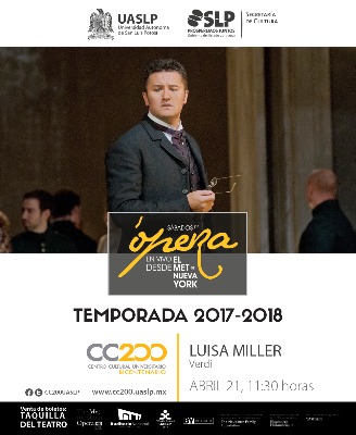 La temporada 2017-2018 que se transmite desde el CC200, continúa este 21 de abril con la ópera "Luisa Miller" del compositor Giuseppe Verdi. Los boletos ya están a la venta en las taquillas del Teatro. La entrada para estudiantes con credencial vigente es de $ 75 pesos y general es de $150.00 pesos.