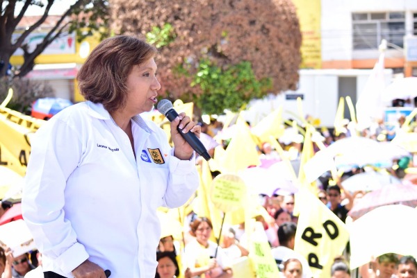 En su gira de campaña estuvo acompañada por Ricardo Gallardo Cardona, candidato a diputado federal por el segundo distrito y el presidente del Comité Estatal del PRD, José Luis Fernández Martínez.